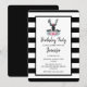 Eine Geburtstagseinladung mit einem schwarzen Hirschkopf mit großen Geweih-Leuten. Geometrische Linien im Hirschgesicht fügen eine einzigartige Touch hinzu. Farbenfrohe rosa Blume und minzgrüne Blätter bilden eine Krone auf seinem Kopf und einen Blumenstrauß unter seinem Kopf. Eine Moutnain-Abrisskizze trägt ebenfalls zum rustikalen Landgefühl bei. Hintergrund ist ein schwarz-weiß gestreiftes Muster.