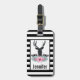 Personalisierter Gepäckanhänger mit einem schwarzen Hirschkopf mit großen Geweih-Anhängern. Geometrische Linien im Hirschgesicht fügen eine kreative Touch hinzu. Farbenfrohe rosa Blume und minzgrüne Blätter bilden einen hübschen Blumenstrauß unter seinem Kopf. Eine Gebirgskizze inmitten der Blume trägt ebenfalls zum rustikalen Landgefühl bei. Hintergrund ist ein schwarz-weiß gestreiftes Muster.