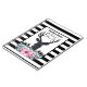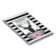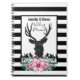 Personalisiertes Wendelnotebook Hochzeitsplaner oder andere Gelegenheiten. Designed mit einem schwarzen Hirschkopf mit großen Geweih. Geometrische Linien im Hirschgesicht fügen eine kreative Touch hinzu. Farbenfrohe rosa Blume und minzgrüne Blätter bilden einen hübschen Blumenstrauß unter seinem Kopf. Eine Gebirgskizze inmitten der Blume trägt ebenfalls zum rustikalen Landgefühl bei. Hintergrund ist ein schwarz-weiß gestreiftes Muster.
