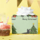 Desteis originelle Cartoon-Illustration eines schwarzen, deutschen Schäferhundes. Der Hund wird von einem festlichen Weihnachtsbaum stehend, der mit roten und gelben Ornamenten verziert ist, einer Perlgarage und einem gelben Stern, der auf dem Baumgipfel steht. Es gibt auch zwei umhüllte Geschenke vom Baum und es gibt einen personalisierbaren Textbereich, der jetzt lautet: "Frohe Weihnachten!". Die Hintergrundfarbe ist hellgrün.