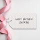 Desteis originelle Cartoon-Illustration eines niedlichen schwarzen Labrador Retriever Zuchthundes. Der Hund wird in einer bunten Geburtstagslandschaft mit pastellfarbenen Geburtstagsballons, Geschenken und einem bunten Banner platziert. Die Pastellfarben Rosa, Grün, Blau, Rot, Orange und lila. Der Hund ist auf einer gelben Holzfußboden-Textur stehend und der Hintergrund hat ein spielerisches pastellfarbenes Polka-Punktmuster. Auf der anderen Seite befindet sich ein personalisierbarer Textbereich.