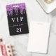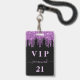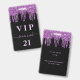 Ein modernes, stilvolles und glamouröses Abzeichen für eine 21. Geburtstagsfeier (oder jedes Alter). Ein schwarzer Hintergrund mit lila Imitaten Glitzer Tropfen, Farbe Tropfausdruck aussehen. Personalisieren und fügen Sie einen Namen und Alter 21. Der Name wird mit einem modernen handgeschriebenen Stilskript mit Swashes geschrieben. Der Text: VIP og Number 21 ist in einer hellrosa Farbe geschrieben. Um die Swashes behalten, löschen Sie nur den Beispielnamen, verlass die Leerzeichen oder Emoji's vor und nach dem Namen. Zurück: Ihre Party-Details.