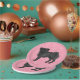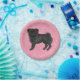 Desteis originelle Cartoon-Illustration eines niedlichen schwarzen Fell Farbe Mops züchten Hund auf einem rosa Hintergrund mit einem Herzmuster in verschiedenen Größen.