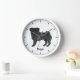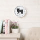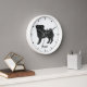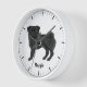 Desteis originelle Cartoon-Illustration eines bezaubernden schwarzen Mantel Farbe Mops züchten Hund. Der Hund ist stehend und schaut zum Betrachter. Der Schwanz ist oben auf dem Rücken des Hundes gefräst. Der Mund des Hundes ist geschlossen und die Augenfarbe braun. Die Uhr ist aus einfachen, modernen Linien. Es gibt auch einen personalisierbaren Textbereich für einen Namen oder einen anderen benutzerdefinierten Text.