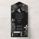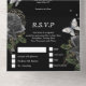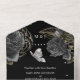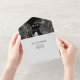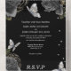 Ein wunderschönes, luxuriöses und gläsernes Ganzes mit Perlschmetterlingsmutter, die auf einem schwarzen Hintergrund mit kohleschwarzen Rose, umgeben von Imitaten, silberne Sprigs, schmiedet. Die Außenseite ist hellpastellgrau und die Aufzugsklappe ist schwarz mit zartem Blumendesign. Das untere Drittel verfügt über eine Antwortkarte mit personalisierter uAwg-Adresse und Menüoptionen, die Ihre Gäste abschließen können. Sie sind ideal für einen Frühling. Sommer; Herbst- oder Winterhochzeit; für eine schwarze Themenparty oder für eine luxuriöse und elegante Hochzeitsszenario.