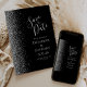 Die links Hand dieses eleganten, modernen Hochzeitsgeschehens bewahrt die Dattelkarte mit einem silbernen Imitat Glitzer Rand. Der anpassbare Text kombiniert silbergraue Handschrift, Kupferplatte und kursiv Schriftart auf schwarzem Hintergrund. Die Rückseite ist in Schwarz und Silber gehalten.