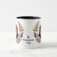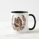 Ein hübscher Herbstkranz in den Farben Zimtbraun, Bräune und Creme umgibt das Aquarellbild eines zauberhaften Spitzes. Das Bild wird zweimal auf der Tasse gedruckt, wobei der eigene Text dazwischen liegt.