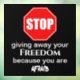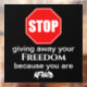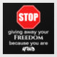 Dieses Design hat ein rotes Stoppschild auf einem schwarzen Hintergrund. Zusammen mit dem Sprichwort aufhören, Ihre Freiheit zu verschenken, weil Sie Angst haben, in weißer Schrift auf weißem Hintergrund.