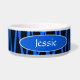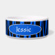 Geben Sie Ihrem Haustier einen modernen Rand mit diesem coolen schwarzen und blauen Zebra striped Nahrungsmittelteller! Pet Tellereigenschaften ein schwarzes und blaues Zebrastreifenmuster ganz herum mit einem blauen ovalen Bereich mit weißer Ordnung auf jeder Seite. Innerhalb jedes Ovals ist Text im weißen mit Ihrem Haustiernamen besonders angefertigt zu werden Schriftart.