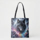 Eine atemberaubende Darstellung eines schwarzen Wolfs, der in einem lebendigen Himmel auftaucht, umgeben von dramatischen Blitzen und farbenfrohen kosmischen Wolken.