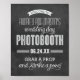 Der Poster-Druck von 8 x 10" Foto kann mit Braut- und Bräutigamen und Hochzeitsterminstext personalisiert werden. Das Unterschreiben lautet: "Herzlich willkommen zum Hochzeitstag-Fotostand von Braut und Groom, Hochzeitstag (xx.xx.xx), schnappen Sie sich einen Requisiten und schlagen Sie eine Pose!". Schwarz strukturierter Chalkboard-Stil Hintergrund mit weißem Text.