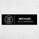 Modernes berufliches schwarzes Namensschild mit Ihrem Firmenlogo. Fügen Sie einen Namen und Titel in einem einfachen weißen Text hinzu.