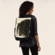 Schwarzes Friesisches Pferd mit einer langen, gewölbten Mähne mit warmen gelben Highlights aus dem späten Nachmittagssonnenlicht. Realistisches Kunstwerk aus einem originalen Ölgemälde des Pferd- und Wildtierkünstlers Crista S. Forest.