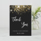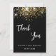 Ein schwarzer Hintergrund, verzierte Imitate goldener Glitzer, Glitzern. Auf der Vorderseite große Hand Schrift und der Text: Danke. Zurück: Personalisieren Sie Ihre Dankeschön Notiz und Namen. Der Name ist mit einem modernen handgeschriebenen Stilskript geschrieben. Weißer Text.