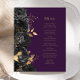 Dieses elegante, moderne Hochzeitsmenü besticht durch eine Mischung aus schwarzen Blume und vergoldeten Imitaten mit Blätter. Passen Sie den goldfarbenen kursiven Text auf einen dunklen lila Hintergrund an. Die Rückseite der Speisekarte ist lila,