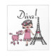 Diva-T-Shirts, Bodysuits, Becher, Taschen, Karten, Aufkleber, Schlüsselketten, Kissen, Wanduhren und viel mehr mit einem niedlichen Divaentwurf, der ein schwarzes behaartes Mädchen in einem Hut und in einem rosa Kleid mit ihrem rosa Pudel nahe dem Eiffel-Turm kennzeichnet!