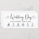 Moderne schwarz-weiße Hochzeitstundenkarten mit stilvollem Typografie-Design mit Hochzeitstag-Icons, Timing-Informationen, chic Kalligraphie-Skript und Herzakzenten. Der einfache und elegante Text, der mit den Braut- und Bräutigamen, dem Hochzeitstermin und den Details der Zeitleiste vollständig personalisiert werden kann.