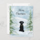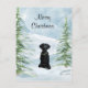Black labarador retriever sits in the snow between two Christmas trees waiting to be decorated holiday postcard