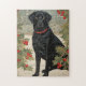 Ein schwarzer Labrador Retriever sitzt in einer schneebedeckten Winterlandschaft, gerahmt von heiligen Ästen mit roten Beeren. Der Hund hat einen roten Kragen und sieht direkt auf den Betrachter mit einem ruhigen und würdigen Ausdruck. Im Hintergrund befindet sich ein schneebedeckter Wald mit nackten Ästen und einer weichen, abgedämpften Farbpalette. Das Bild ruft ein Gefühl der Ruhe und der Schönheit des Winters hervor.