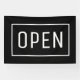 Offenes Zeichen. Einfach weiß auf schwarzer Fahne mit einem schmalen weißen Rahmen.