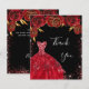 Ein weiblicher und eleganter Geburtstag Dankeschön Karte. Schwarzer Hintergrund mit rotem Imitat, Glitzer, Glitzern, rote Rosen und rotem Kleid. vorne ein großes handgeschriebenes Skript und den Text: Danke. Zurück: Personalisieren Sie Ihre Dankeschön Notiz und Name. Der Name ist mit einem modernen handgeschriebenen Stilskript geschrieben.