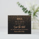 Ein schwarzer Hintergrund mit goldenem Konfetti. Personalisieren und fügen Sie Datum und Name/Alter hinzu. Der Text: Save the Date ist mit einem großen angesagten, handgeschriebenen Stilskript geschrieben. 1 Blatt = 1 Save the Date bedruckte Kante bis Kante.