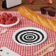Schwarz-Weiß gestreifte konzentrische Kreise zwischen den Tellern für ein stilvolles Punk-Kind oder ein erwachsenes Halloween-Party.