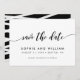 Stilvolle Save the Date-Karte mit den Worten "Save the Date" in einer entspannenden kursiven Schrift in schwarz auf weißem Hintergrund. Die Karte enthält eine schwarze Rückseite mit überlappenden weißen Linien. Personalisieren Sie es, indem Sie den Platzhalter-Text ersetzen. Für weitere Optionen, wie zum Beispiel den Schriftart zu ändern und ihn zu vergrößern oder zu verändern, klicken Sie auf den Button "Anpassen". *Bitte beachten Sie, dass das Zazzle-Wasserzeichen, das in der Zoomvorschau angezeigt wird, NICHT auf dem gedruckten Endprodukt erscheint. © Rosewood and Citrus