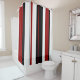 Dieser Duschvorhang weist schwarz-rote und weiße vertikale Streifen auf.