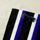 Lebhaftes, schwarz, blau und weiß gestreiftes Strandtuch.
