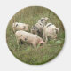 Dieser Magnet zeigt ein schönes Foto einer Gruppe niedlicher Schweine auf einem Feld. Einige der Schweine rutschen auf der Erde herum, während andere auf sie schauen.