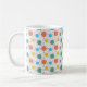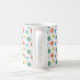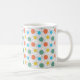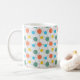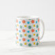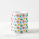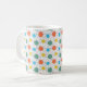 Diese Tasse hat ein modernes Kreislaufdesign mit Linien in Orange, Gelb, Türkis und Grün.