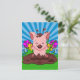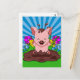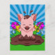 Niedliches rosa Säuglingschwein spielt glücklich in einem Becken aus braunem Schlamm. Hinter ihm sind einige farbenfrohe Blume, grünes Gras und ein blauer Sonnenbursthimmel.