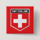 Die Nationalflagge der Schweiz ist in eine Schildform eingegossen, die auch das Set des Landesnamens über der Fahne hat.