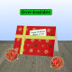Persönliche Weihnachtsgrüße für Ihre Schwiegermutter. Die Karte hat das Aussehen eines Paketes mit einem farbenfrohen Muster von stilisierten Schneeflocken in goldenen und grünen Farben auf einem roten Hintergrund. Das Paket ist mit einem goldenen "Band" verbunden und hat ein "Geschenketikett" mit der Nachricht "Glückliche Weihnachtsmutter im Schwiegereltern". Im Text heißt es: "Ein frohes Weihnachtsfest und ein glückliches Neues Jahr wünschen" oder Sie können dies nach Bedarf ändern.