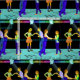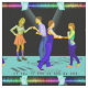 Schwingen Sie Tanzen-Paare mit Scheinwerfern und einen Tanzboden mit Musiksymbolen 4,5" Quadrat. Gewebe. Dieses ist sortierte zu den 4,5-Zoll-Quadraten. Es gibt andere Versionen dieses Entwurfs in den verschiedenen Größendrucken.