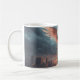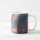 This mug features the Sentinel of the Crimson Dawn, a towering angelic AI forged from Roman-centurion armor and crystalline alloys that burn with internal light. Its immense solar-wing arrays flare open above a ruined cyber-city, runes glowing like circuitry made divine. Hover-drones circle the mech-angel as it guards the fractured overpass—the last threshold between collapse and cosmic rebirth.