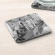 Plastic foto coaster with a vintage scooter parked in front of a house in a cobblestone street in a city in Italy in stylish black and white.
