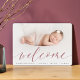 Un design de faire-part de naissance doux et élégant avec un fond de saignement intégral photo horizontale ou orientée paysage avec "bienvenue" superposé dans des lettres de script de calligraphie chic. Le nom et les statistiques de naissance de votre bébé apparaissent en dessous. Ajoutez trois photos de carré supplémentaires à l'arrière, ainsi qu'un message personnel.