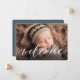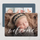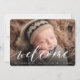 Un design faire-part de naissance doux et élégant avec un fond de saignement plein horizontale ou une photo orientée paysage avec "bienvenue" superposé dans le script de calligraphie blanc chic lettrage. Le nom et les statistiques de naissance de votre bébé apparaissent en dessous. Ajoutez trois photos de carré supplémentaires à l'arrière, ainsi qu'un message personnel.