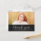 Carte de remerciements de Graduation Rustique à Script Blanc tendance. Design par Elke Clarke © Visitez notre boutique www.zazzle.com/monogramgallery* pour plus de couleurs et de styles. Ajoutez votre propre photo et texte. Une simple typographie blanche manuscrite texte de police de script superpose sur un arrière - plan de tableau noir (effet photo imprimé) avec les mots "Merci". Remplacez l'exemple de photo par le vôtre.