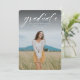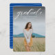 Un script classique simple "gradué" en blanc accentue une seule photo verticale de votre grade. Ce faire-part d'obtention de diplômes fonctionne pour les diplômés du collège ou du secondaire et est assez simple pour laisser briller votre photo. C'est un design intemporel et dispose également d'un dossier rayé avec une couleur personnalisable (par défaut le bleu). Les mots sont en haut de la photo mais le design est aussi disponible avec les mots en bas.