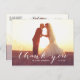 Envoyez votre message de remerciement mariage à vos amis et à votre famille en utilisant cette carte postale de remerciement simple et magnifique avec les mots "merci" écrit dans un script d'écriture blanc superposé. Cartes postales en Merci mariage avec votre photo. Conception par Elke Clarke©. Remplacez l'exemple de photo par le vôtre. Ajoutez votre message de remerciement personnel sur le dos ou laissez vide et écrivez votre message en personne. Autres couleurs disponibles.