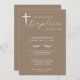 Élégant Script Moderne Baptême Beige Invitation. Personnalisez avec le nom du bébé, la date du baptême, l'emplacement de l'église, l'adresse de résidence de la famille et la réponse RSVP.