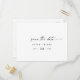 Ce script moderne horizontal enregistrer la date carte postale est parfait pour un mariage minimaliste. Le design simple en noir et blanc présente une typographie industrielle unique avec style boho moderne. Personnalisable dans n'importe quelle couleur. Gardez le design minimal et élégant, en l'état, ou personnalisez-le en ajoutant vos propres graphiques et artwork.