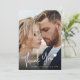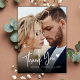 Élégant et moderne carte de remerciements 2-photo mariage avec une photo verticale à fond de sang sur le devant avec un blanc manuscrit "Merci" en script de calligraphie et un motif de coeur d'amour mignon. L'arrière comprend de l'espace pour une deuxième photo et un message pré-écrit. Entièrement personnalisable : ajoutez vos noms et vos notes, ou supprimez le texte pour écrire votre message à la main. Un carte de remerciements chic et photo pour les jeunes mariés élégants. Vous avez besoin d'aide ou d'éléments correspondants ? Message-moi à tout moment !