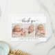 Élégant Design Moderne Script 3 Photo Collage Nouveau-né Carte de Faire-part de naissance Merci bébé. Dispose d'un beau texte "merci" dans une calligraphie manuscrite swash tail script de police. Le message personnel préfabriqué et les statistiques de naissance avec le nom du bébé sont inclus en noir et blanc. Idéal pour bébé garçon ou petite fille. Facile à personnaliser avec votre photo bébé et les détails.