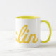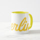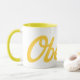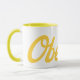 Genießen Sie Ihren Kaffee mit Flair in dieser zweifarbigen, gelben Tasse mit scharfgelbem Oberlin-Text.