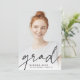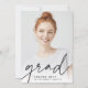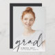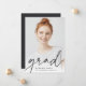 Modern graduation announcement for your class of 2022 grad features a single vertical/portrait oriented photo, with "grad" along the bottom in dark charcoal black handwritten script lettering. The graduate's name and school appear along the bottom. Add a personal announcement to the back, along with an additional photo.