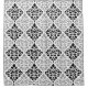 Dekorative Schriftrolle und Blattfeuchtigkeitsmuster in schwarz-grauem Detail auf weißem Hintergrund.